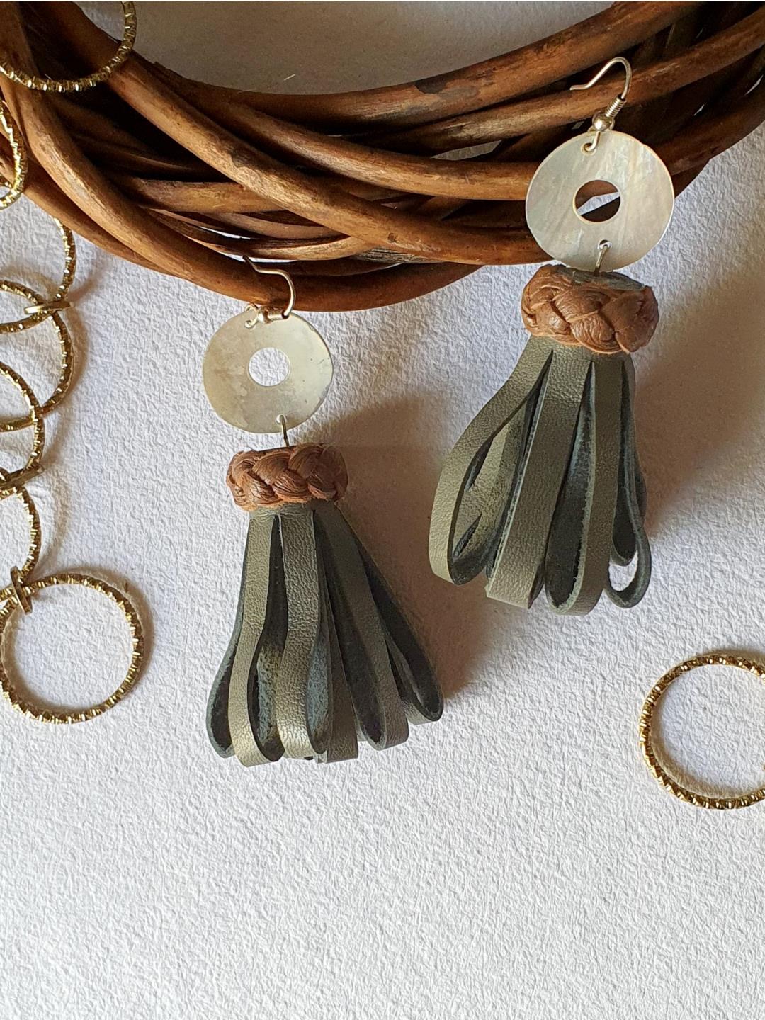 Chunky leather tassel earrings with a tan braid and a shell bead We are redefining the word new by upcycling leather off-cuts to give them a second purpose and each product a new skin.