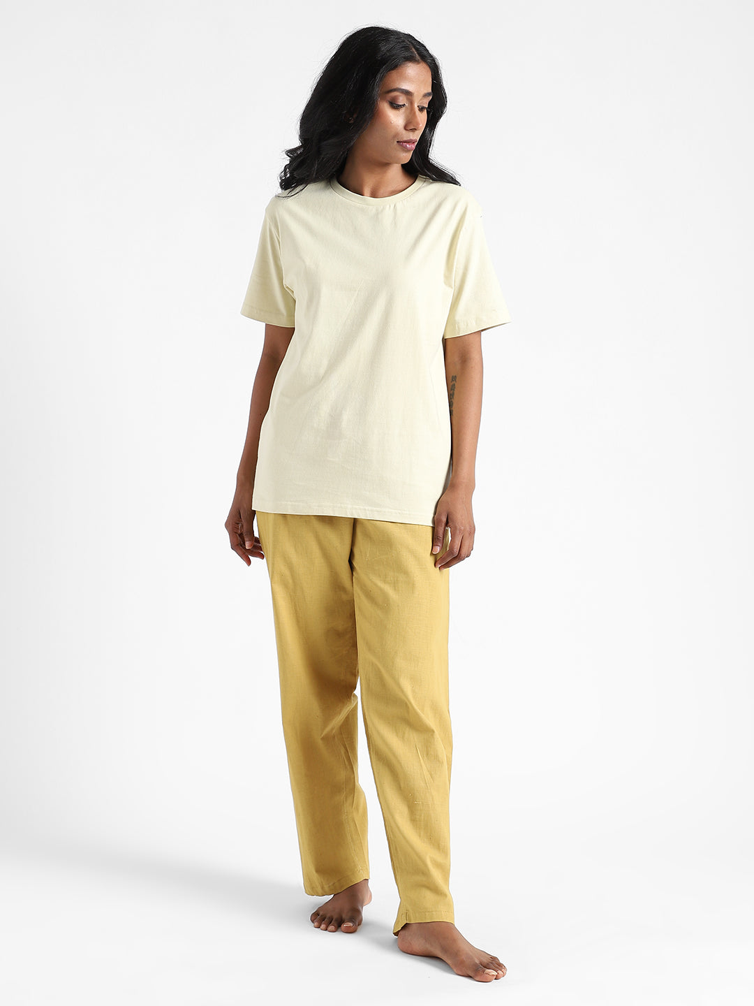 This Unisex yellow color tee is made of 100% Organic Cotton & Dyed from Natural Plant-based dyes. It is very comfortable for your skin, and body and comes with comfort fit. Since it's an all-time vintage classic you could wear it for a casual outing, yoga/gym wear, or simply use it for night wear. This tee gets softer with age and washing.