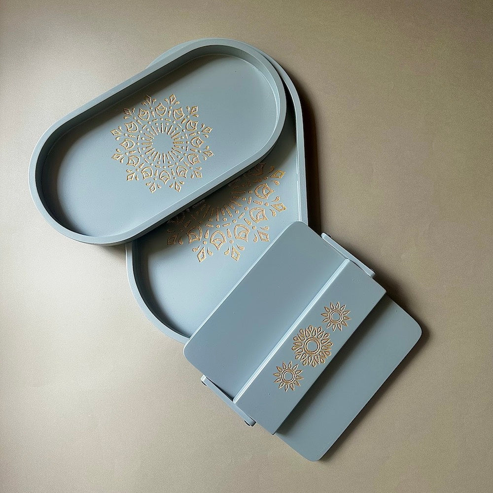 Elevate your dining with our bundle: Pebble Grey Oval Tray Set of 2 and Mandala Tissue Tray. Timeless beauty meets vibrant colors. Stylish trays and a refillable tissue tray. A perfect blend of elegance and functionality.
