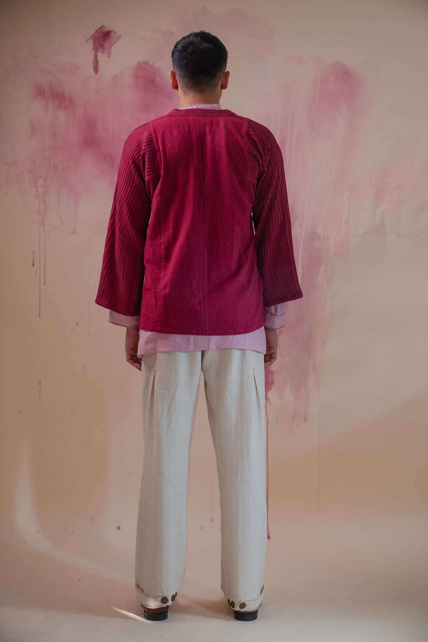 Elevating our classic haori silhouette, this design showcases meticulous pintucks detailing on the sleeves. The relaxed armhole with panelling ensures a comfortable fit, while patch pockets feature a distinctive wooden buckle enclosure. Finished with a single statement button for enclosure, this haori becomes a perfect trans-seasonal overlay, making it an ideal addition to your versatile wardrobe.