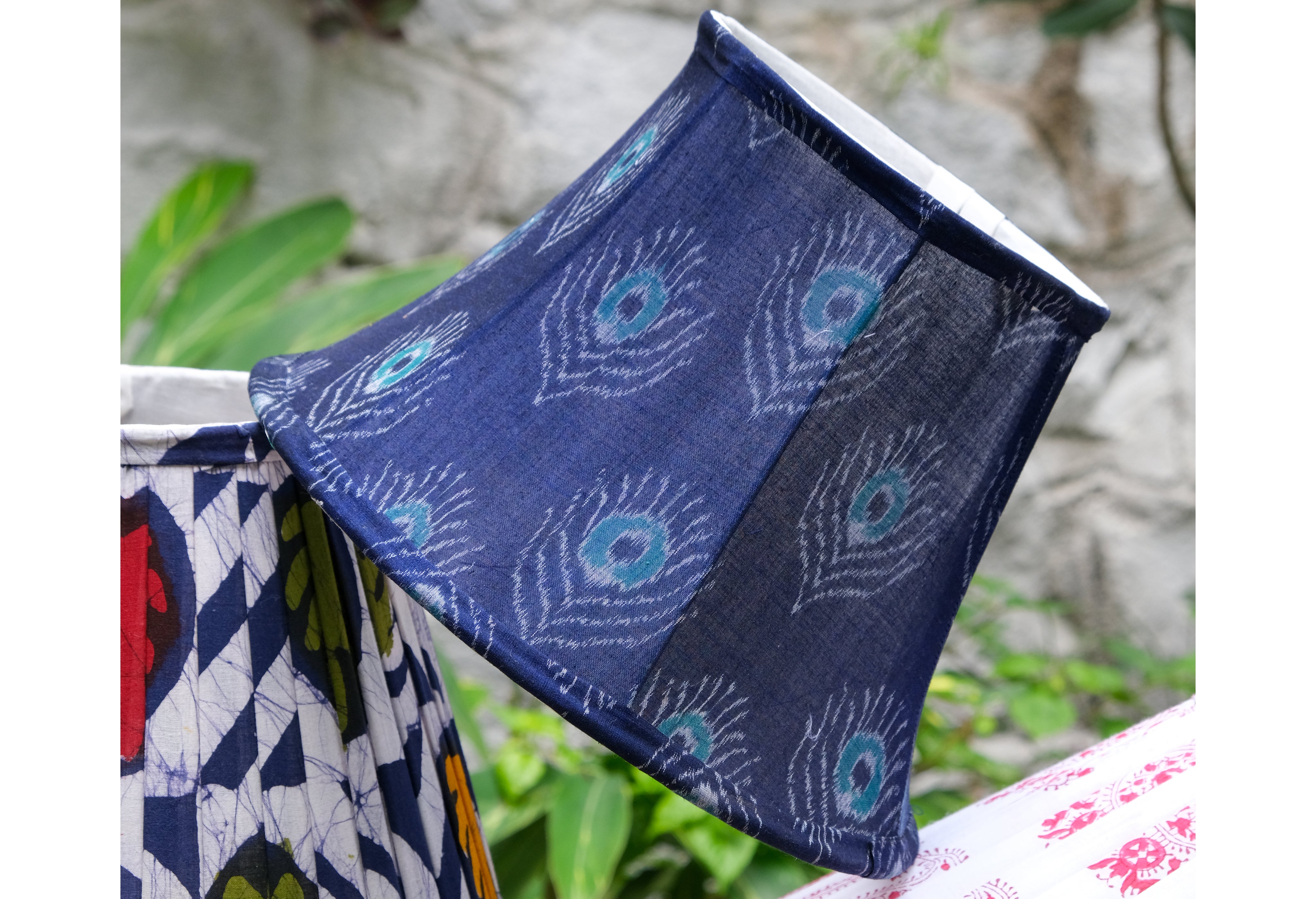 Ikat weave is a blend of many traditions, Ikat word originating from the Indonesian languages and means "to bind". The technique involves binding individual yarns or bundles of yarns with a tight wrapping, then dyeing the yarns, and altering the binding to create different patterns. Plume Ikat is beautfully weaved pattern of a peackcock's feather and shows beautifully as a lampshade.