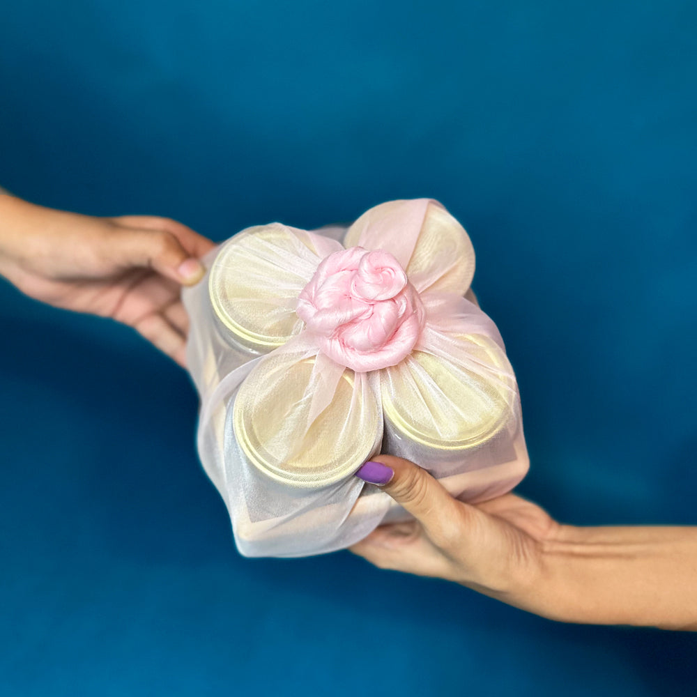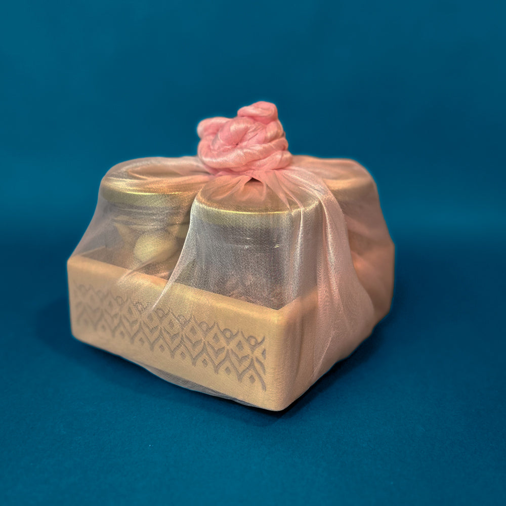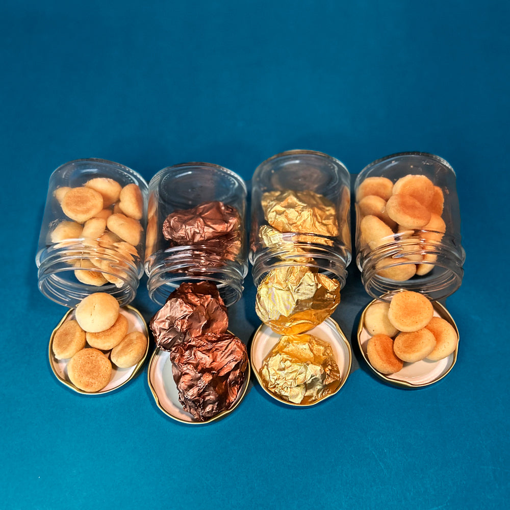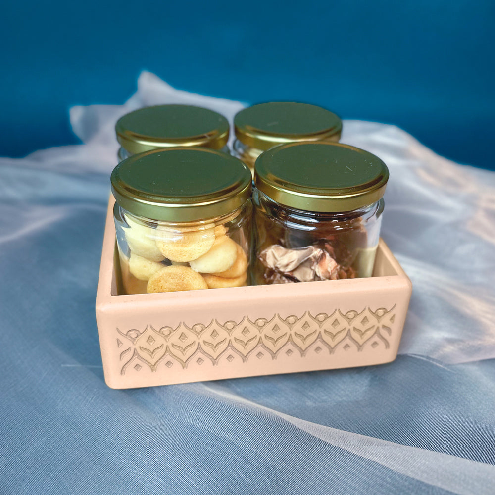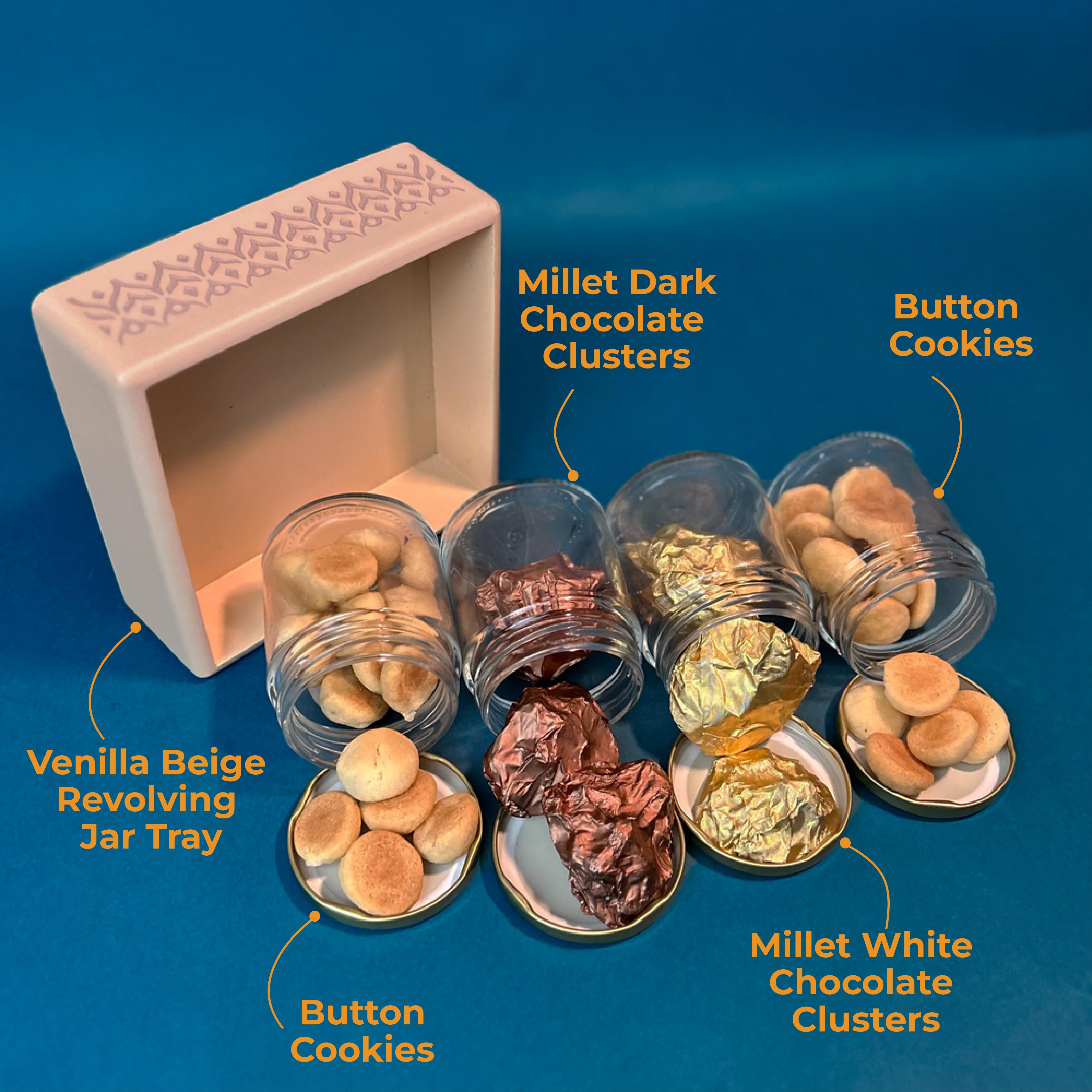 Introducing our "Revolving Sweet Treats Jar Stand" gift hamper, an elegant and practical addition to any kitchen or dining area. This beautifully crafted wooden stand features four revolving jars, each filled with chocolates or cookies