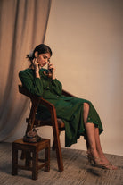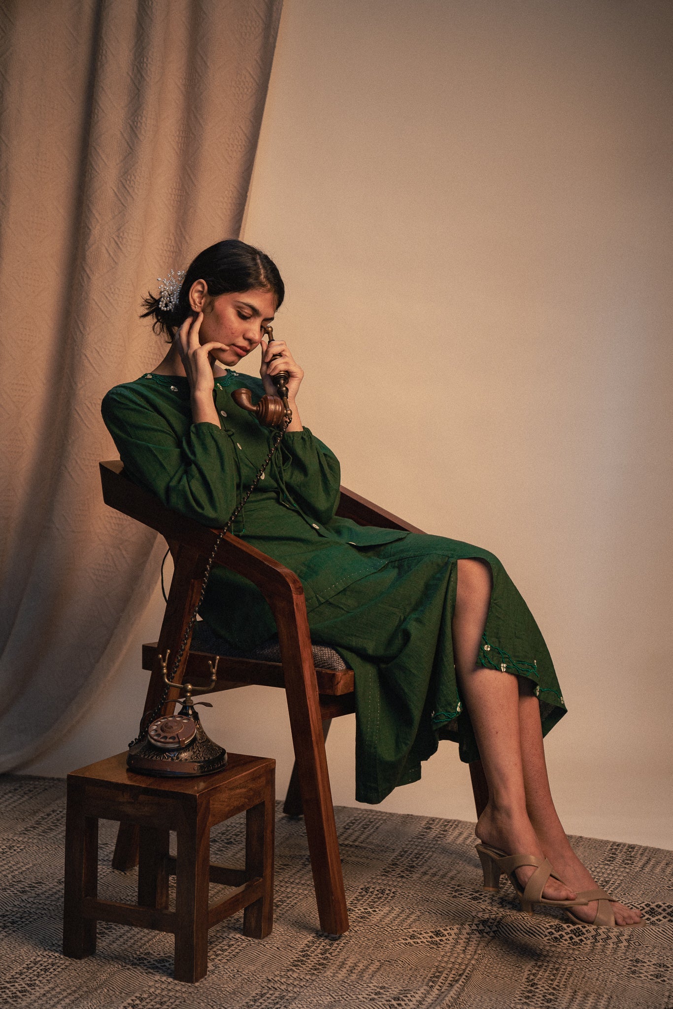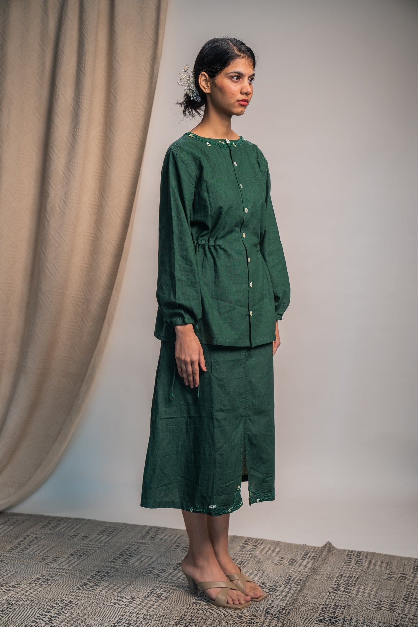 This Rewind Flared Skirt comes in a rich and elegant colour of green that we call Secret Path. It has been dyed naturally with a mixture of Myrobalan and Indigo.