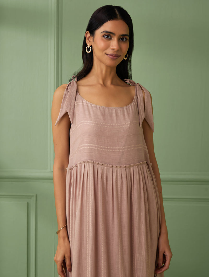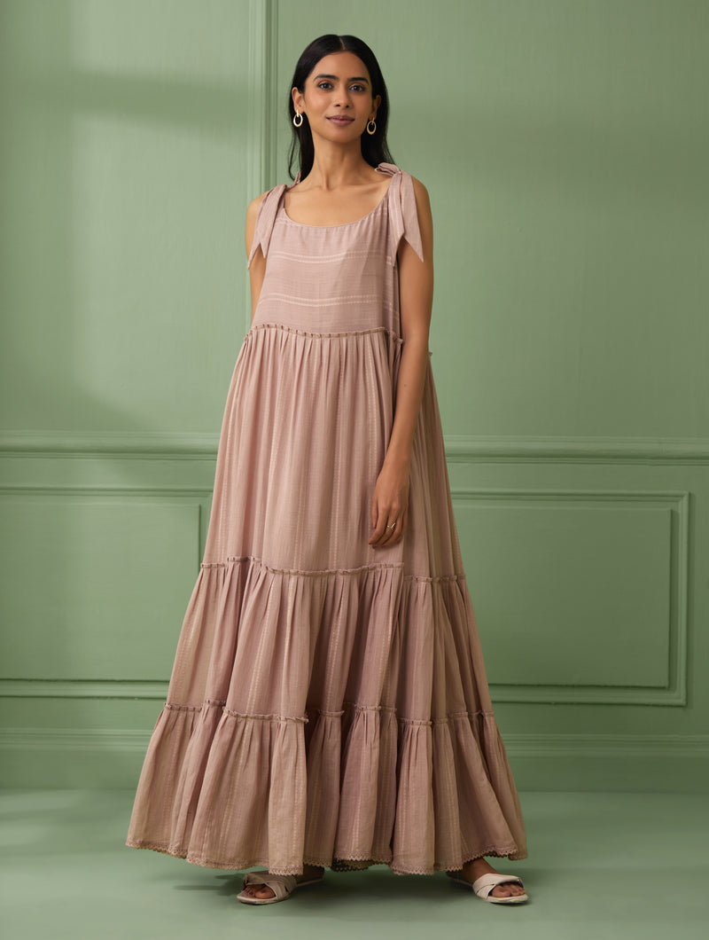 A rose tiered maxi dress in soft cotton with breezy flare and flounce. It has tie up belts on shoulders which are adjustable. The hemline of the dress is adorned with matching handmade lace detail. This dress is fully lined with soft and comfortable cotton