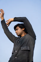 Replete with a spread collar, this self-checked black shirt makes a breezy must have for any summer wardrobe. This light and breathable cotton shirt adorned with a modern take on classic running stitches and French knots on the flaps.