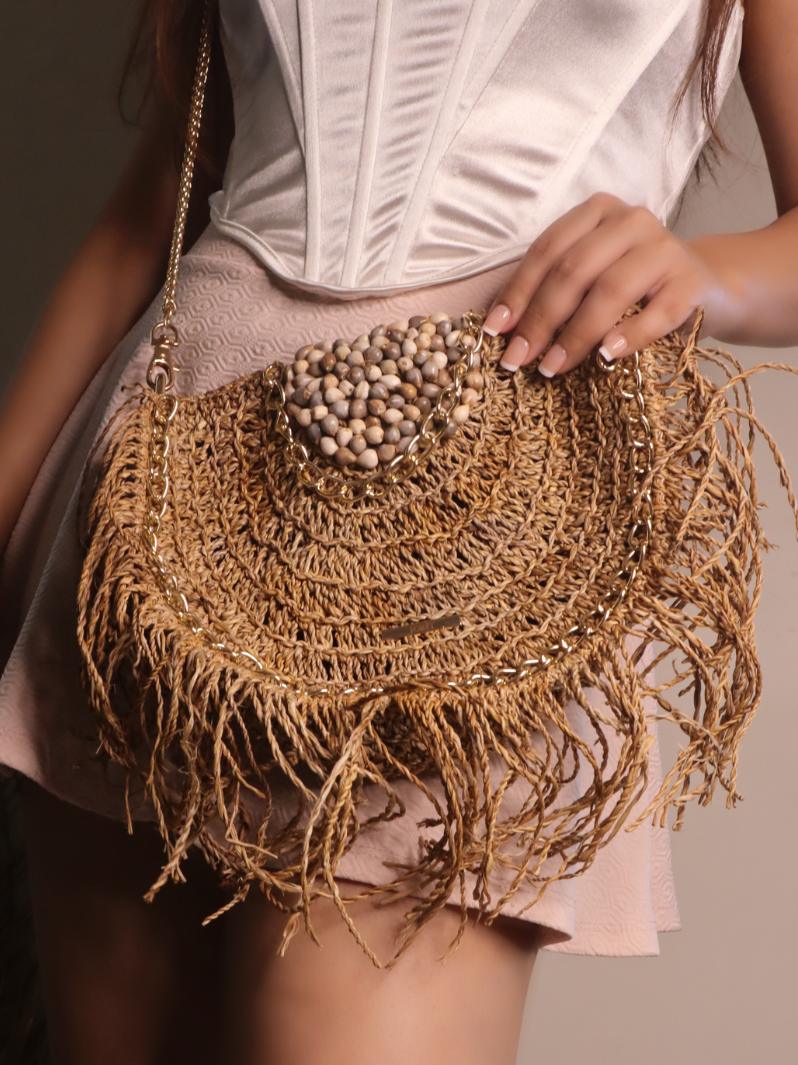 Comes in a natural beige/brown color that beautifully complements its organic aesthetic. The subtle variations in shade and texture are inherent to the use of natural materials, making each bag truly unique and exclusive to its owner.
