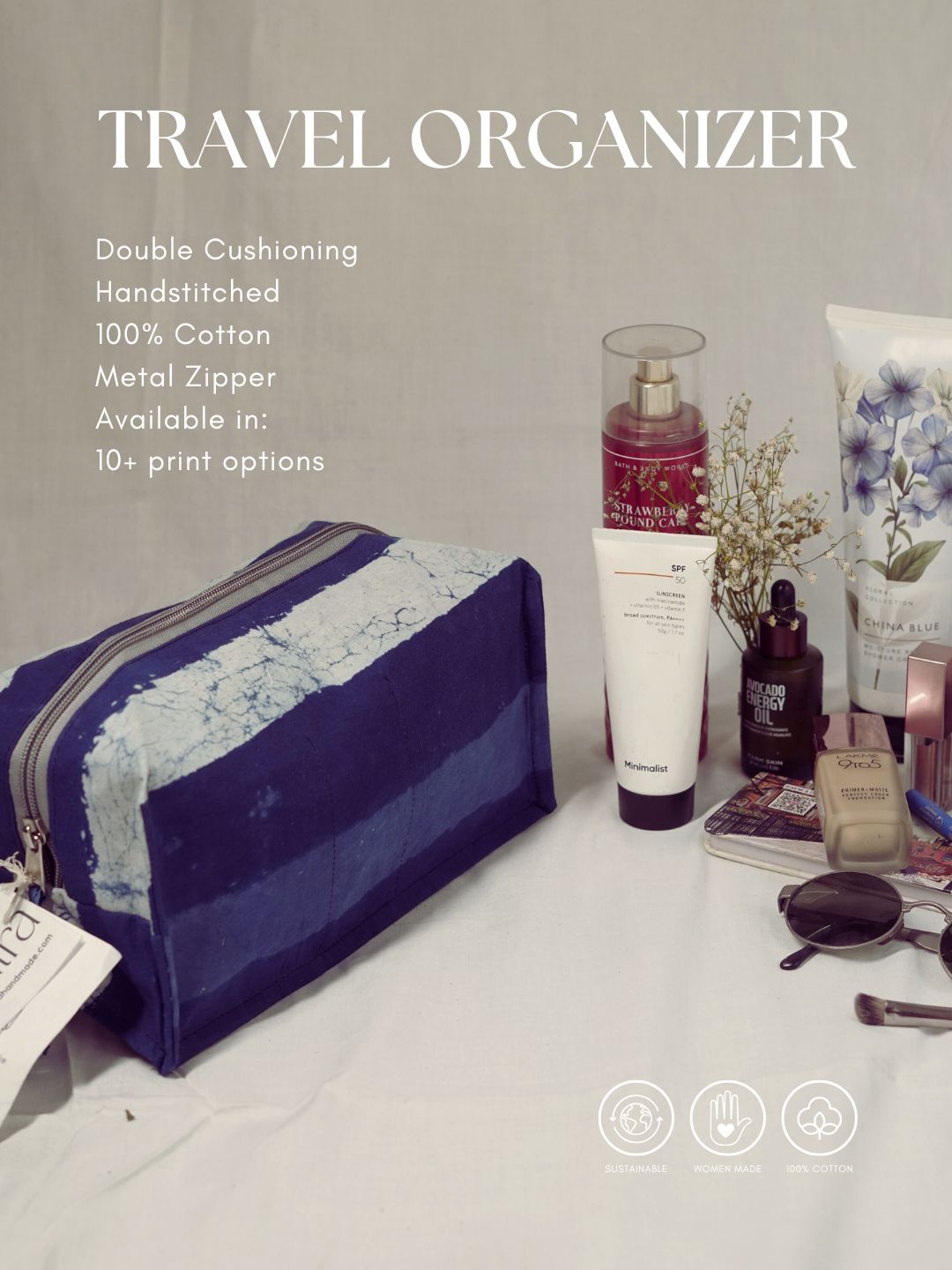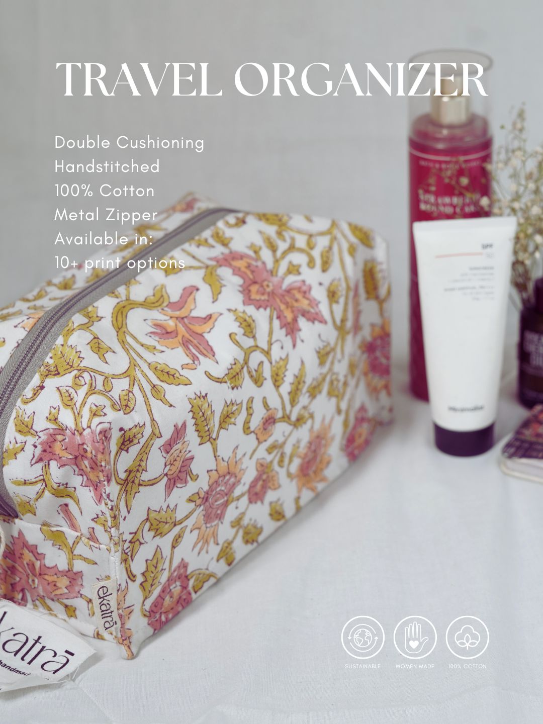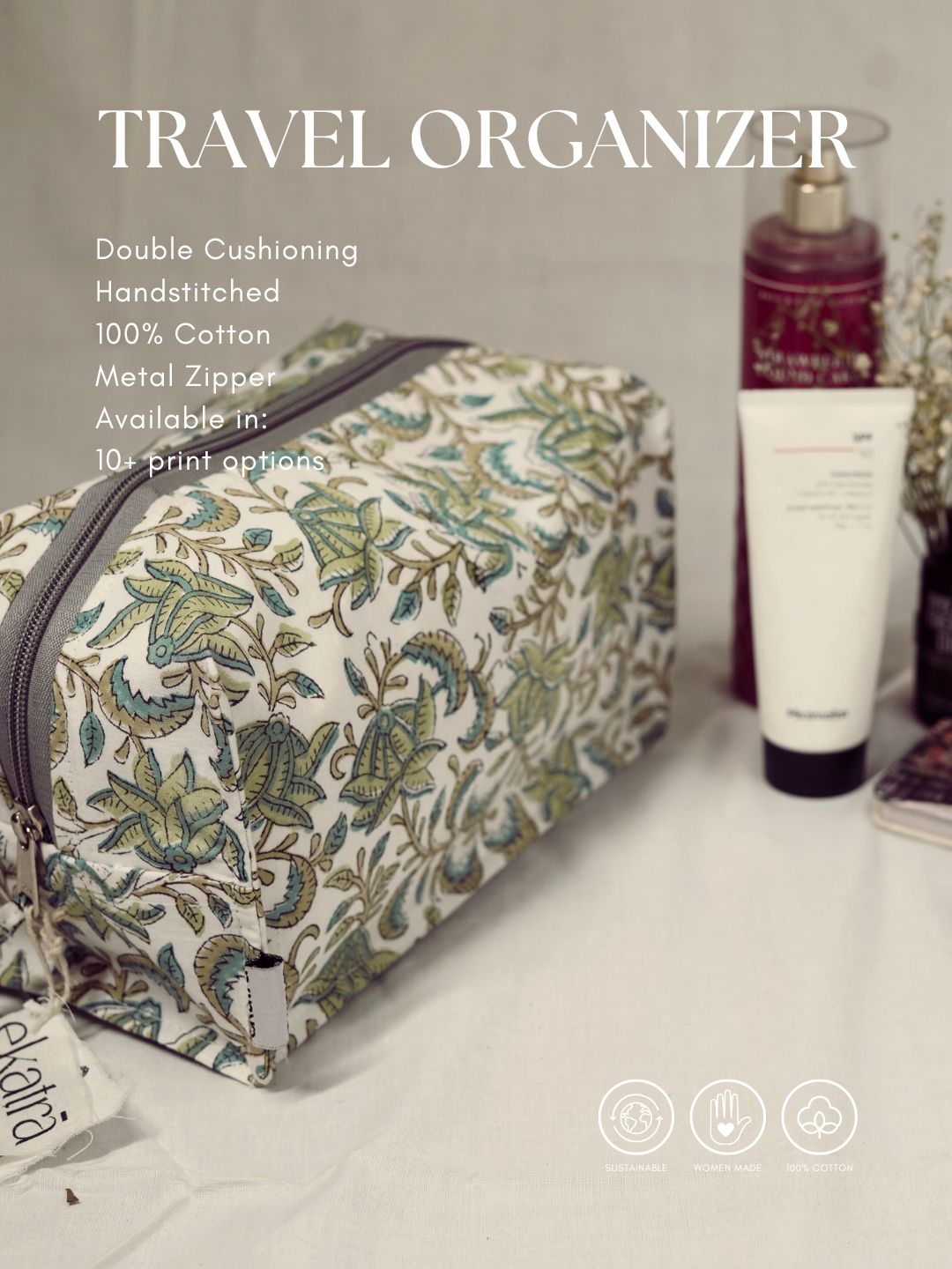 Enjoy your travels with grace and style using the Sustainable Cotton Travel Pouch/Organizer by Ekatra.