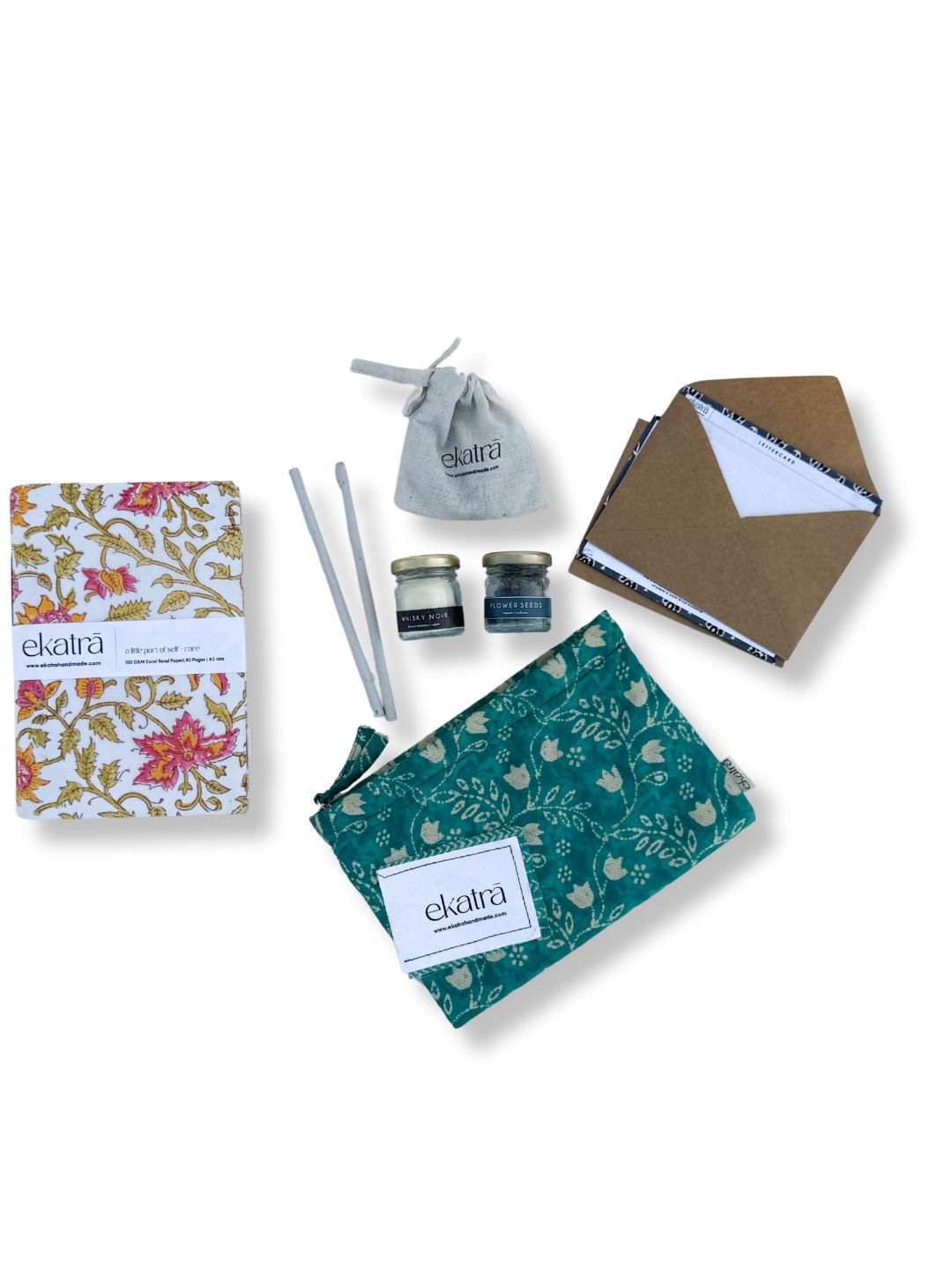 This Hamper is packed with: A5 Journal Pouch Scented candle Seed jar Chocolate bag Newspaper pencil x 2 Notecard