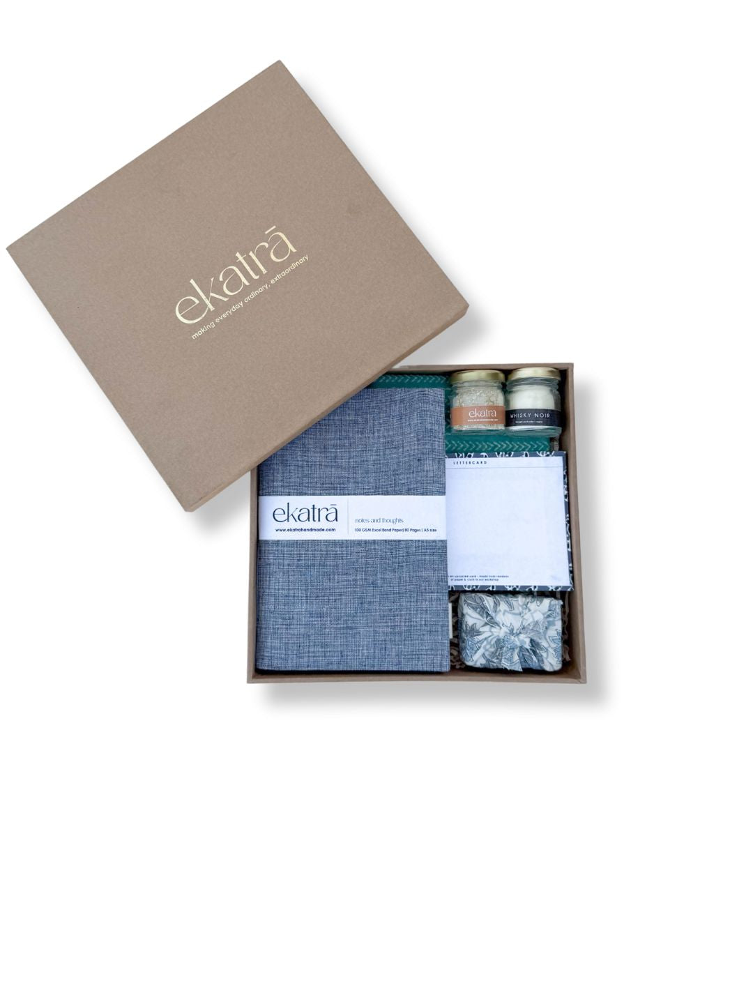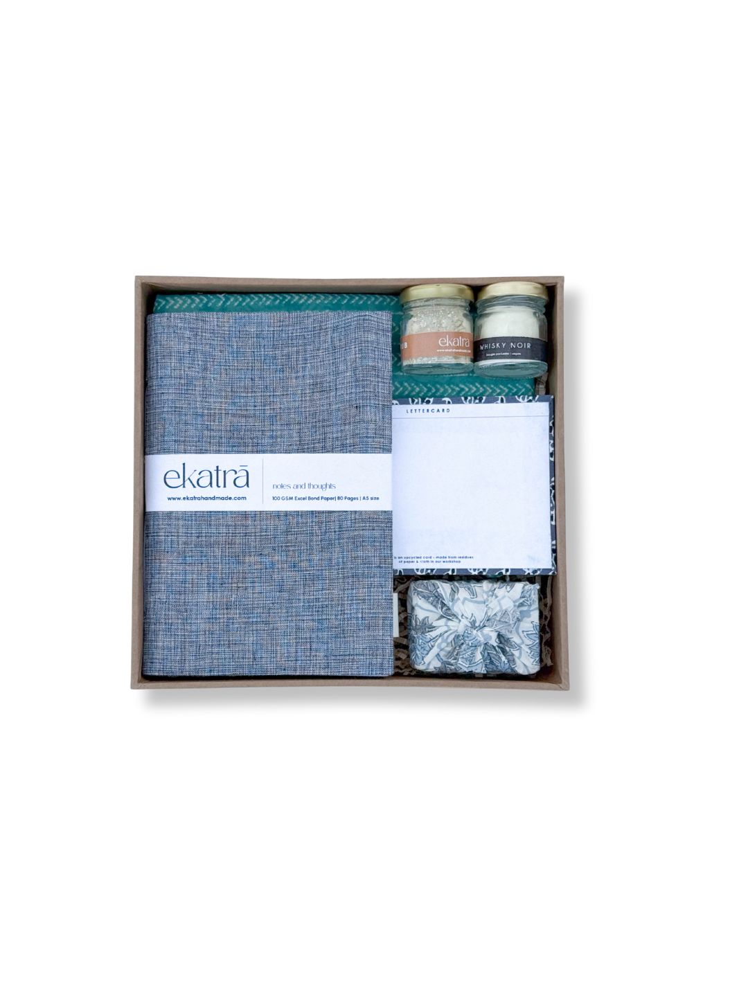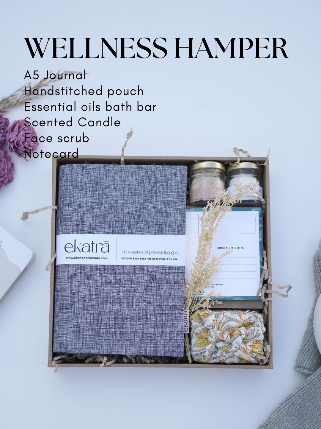 The hamper is packed with : A5 Journal Handstitched pouch Essential oils bath bar Scented Candle Face scrub Notecard