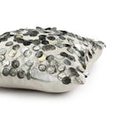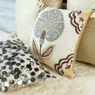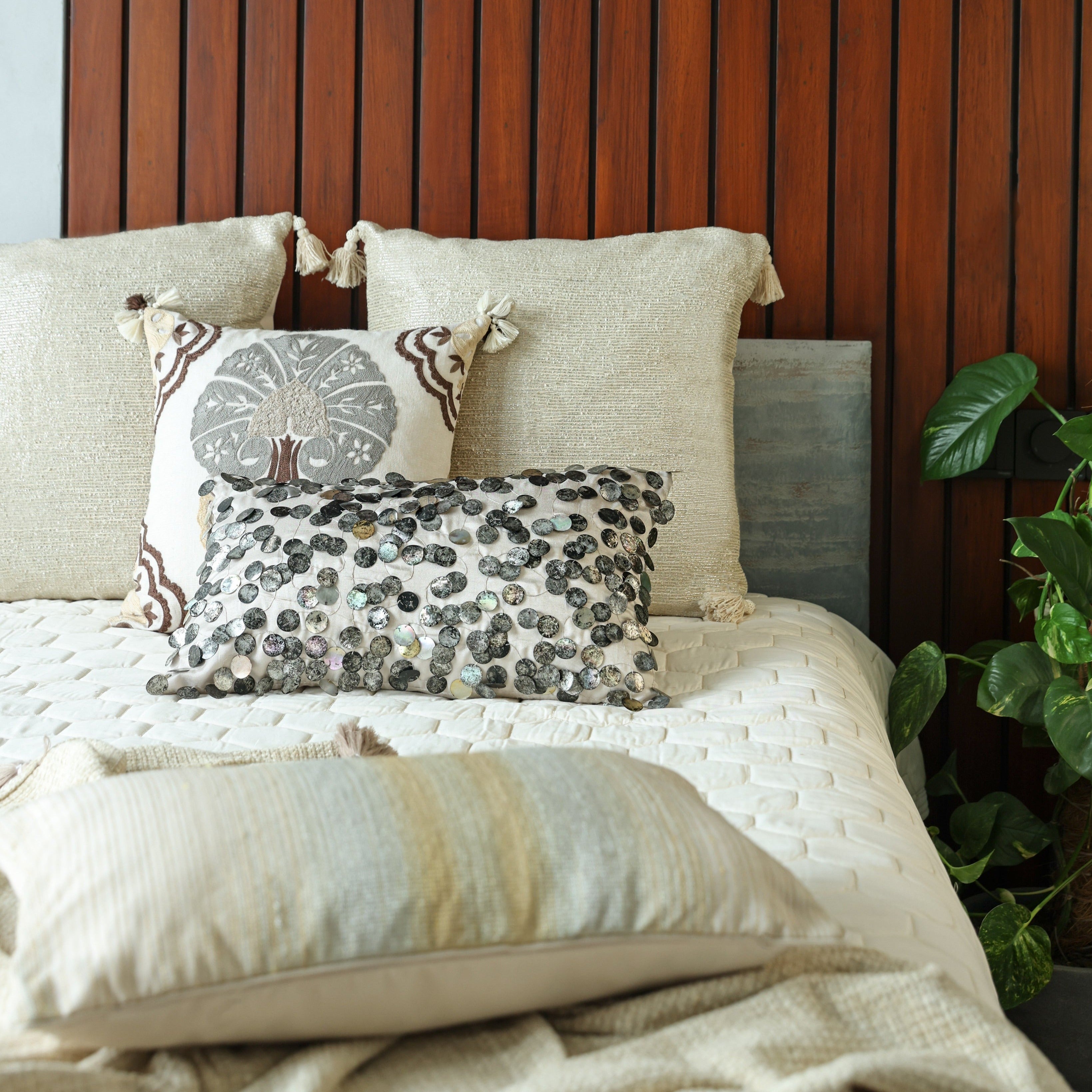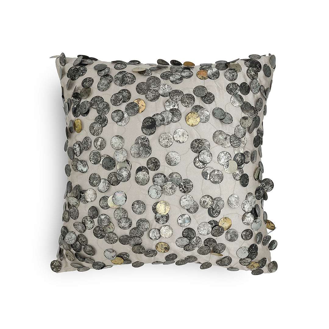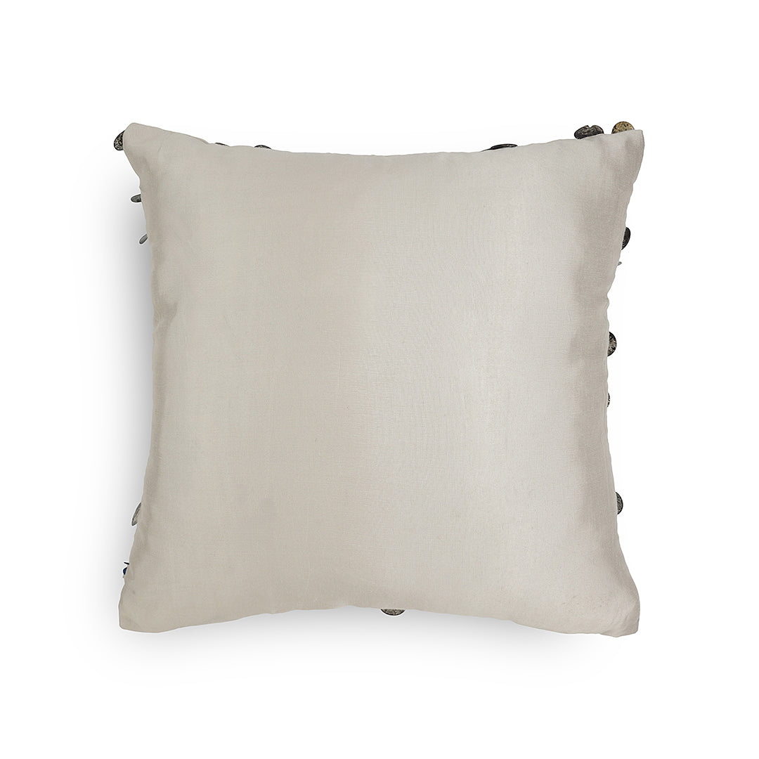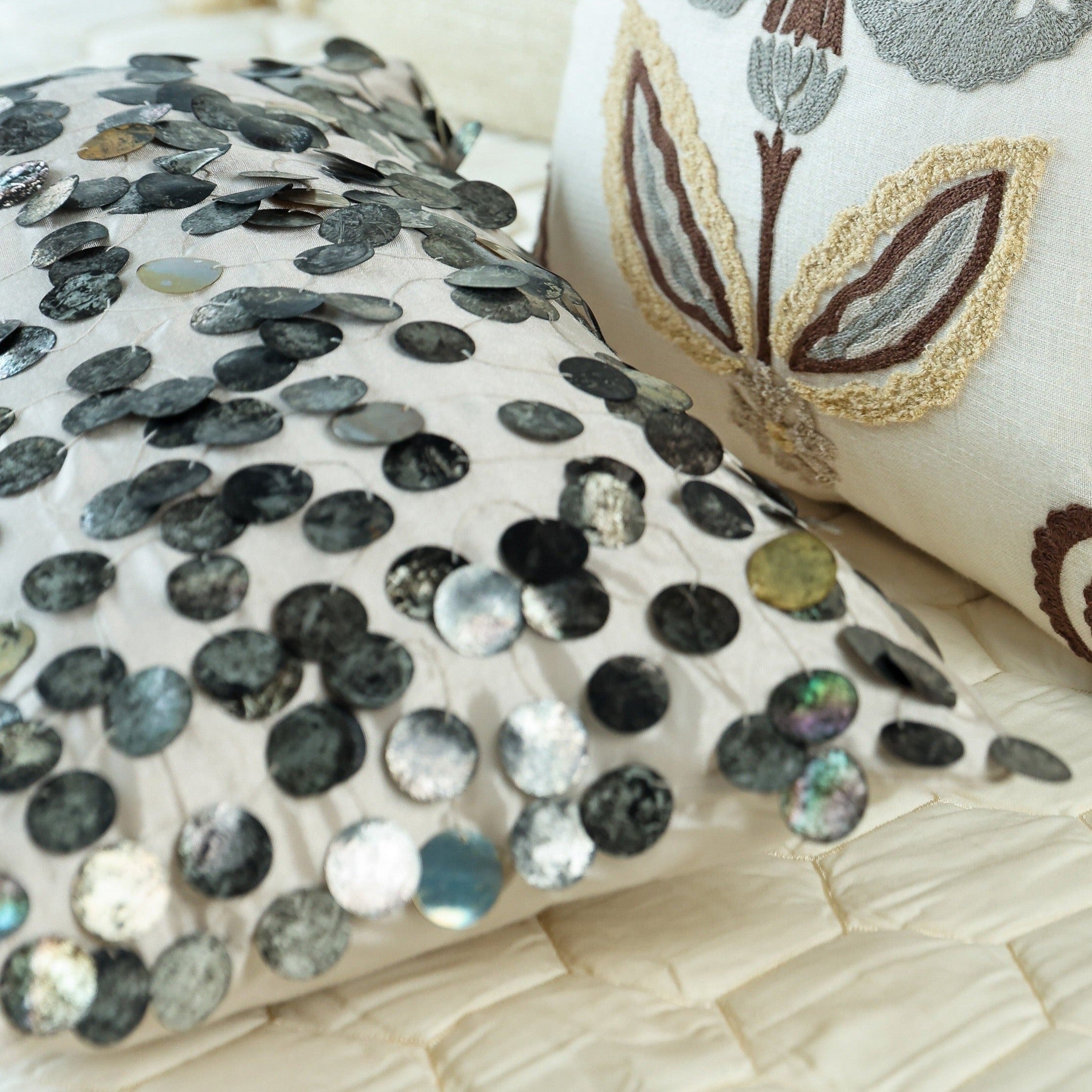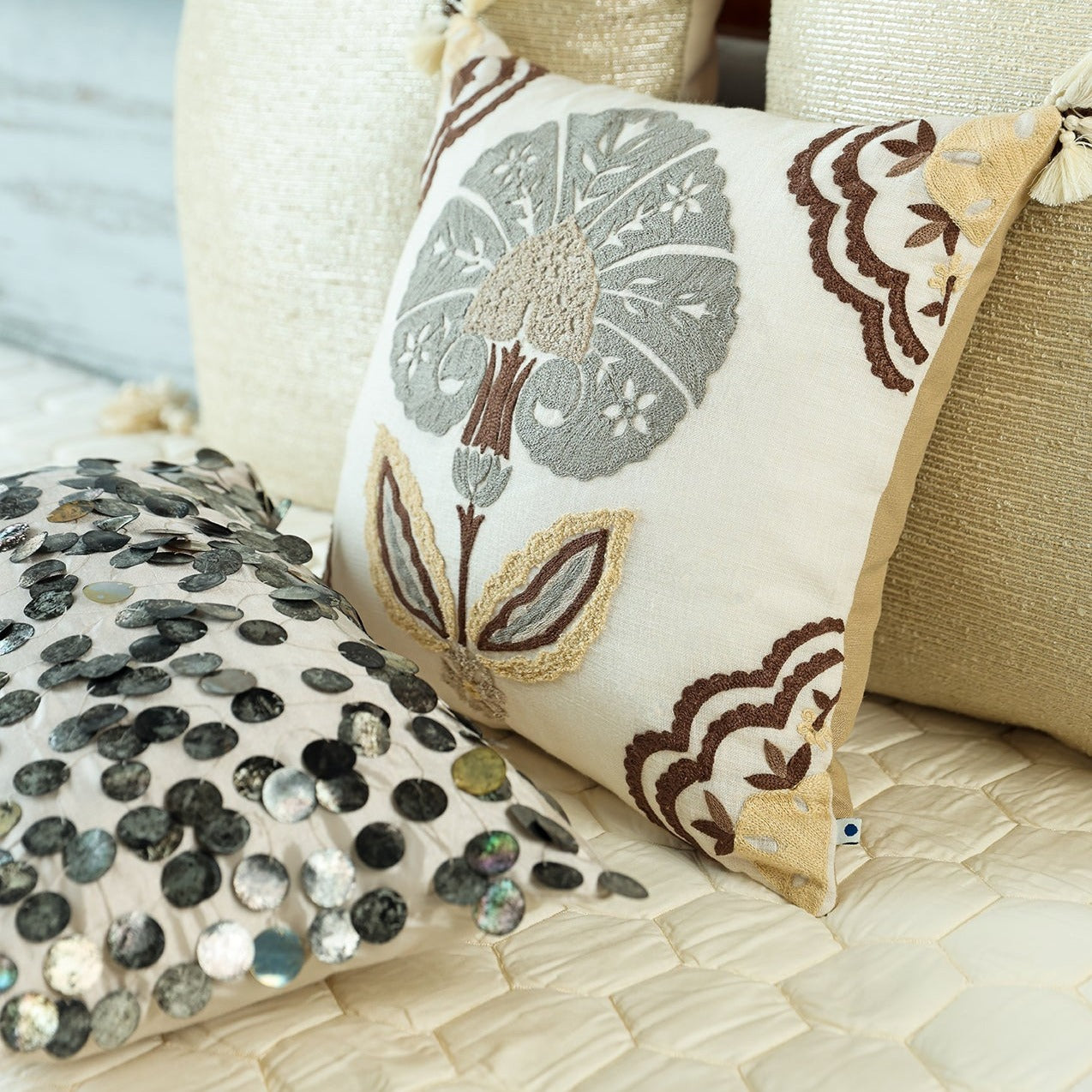 This exquisite cushion is adorned with tarnished sequins, delicately embroidered onto a lustrous, silky beige fabric. The interplay of textures creates a captivating visual contrast, making it a luxurious statement piece that adds opulence to any space. The deep turquoise colours in this off set by the gold and silver sequins, add the perfect luxe in your setting
