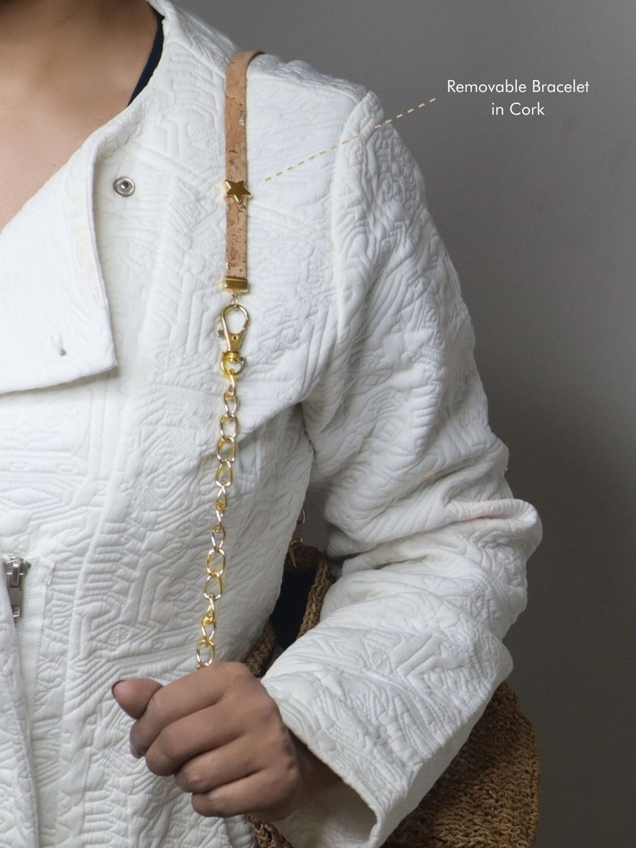 Just like her name suggests, she's Iconic and will make you fall in love at first sight. She's a star, and she comes with a bracelet that can be donned as an extension to the bag or as a bracelet on its own. She’s super cute, and roomy, and adds a little charm to your outfits. Although small, the mini bucket bag is roomy and you can adjust the space by adjusting the cork threads on the sides.