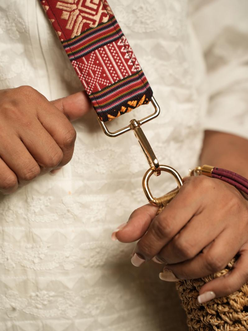 Adjustable woven shoulder strap with matching tassels. Comes with the option of multicoloured belt with brown tassels or multicoloured belt with maroon tassels. Available in natural beige/Creme/brown shades that beautifully complement its organic aesthetic. The subtle variations in shade and texture are inherent to the use of natural materials, making each bag truly unique and exclusive to its owner.