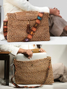This cross-body messenger bag is not just your ordinary laptop bag; it's a statement piece that showcases the beauty of nature and the skill of dedicated artisans.Designed to protect and carry your laptop in style, this messenger bag offers both functionality and fashion-forward appeal. Each stitch tells a story, as the banana bark knit intertwines seamlessly with the timeless elegance of Ilkal handloom lining. The durable and protective woven banana bark material ensures the safety of your devices. The spacious & cushioned interior compartment provides ample room for your laptop, documents, and essentials, while the cross-body design ensures comfortable and secure wear. The additional compartments and pockets keep your belongings organized and easily accessible. Whether you're heading to work, a coffee shop, or traveling, this laptop bag combines functionality and style seamlessly.