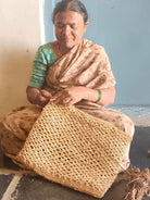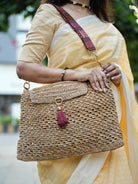 This cross-body messenger bag is not just your ordinary laptop bag; it's a statement piece that showcases the beauty of nature and the skill of dedicated artisans.Designed to protect and carry your laptop in style, this messenger bag offers both functionality and fashion-forward appeal. Each stitch tells a story, as the banana bark knit intertwines seamlessly with the timeless elegance of Ilkal handloom lining. The durable and protective woven banana bark material ensures the safety of your devices. The spacious & cushioned interior compartment provides ample room for your laptop, documents, and essentials, while the cross-body design ensures comfortable and secure wear.The additional compartments and pockets keep your belongings organized and easily accessible. Whether you're heading to work, a coffee shop, or traveling, this laptop bag combines functionality and style seamlessly.