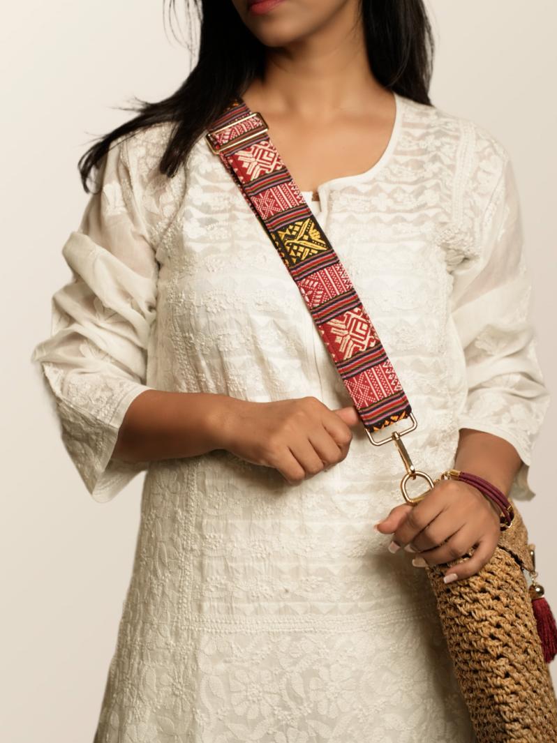 Adjustable woven shoulder strap with matching tassels. Comes with the option of multicoloured belt with brown tassels or multicoloured belt with maroon tassels. Available in natural beige/Creme/brown shades that beautifully complement its organic aesthetic. The subtle variations in shade and texture are inherent to the use of natural materials, making each bag truly unique and exclusive to its ownerMeasurements: 40 x 27 x 2 Centimeter