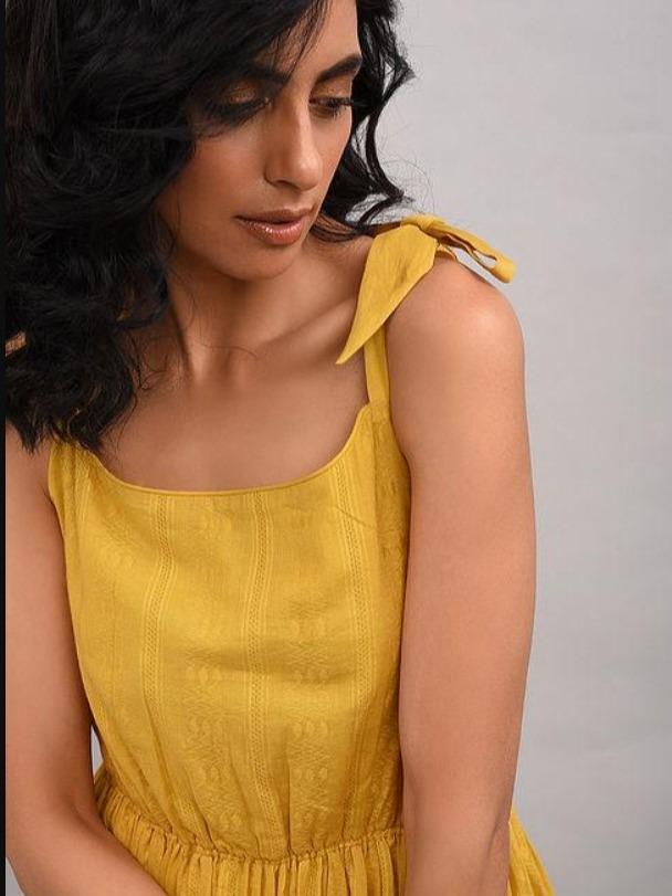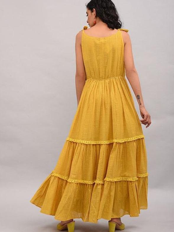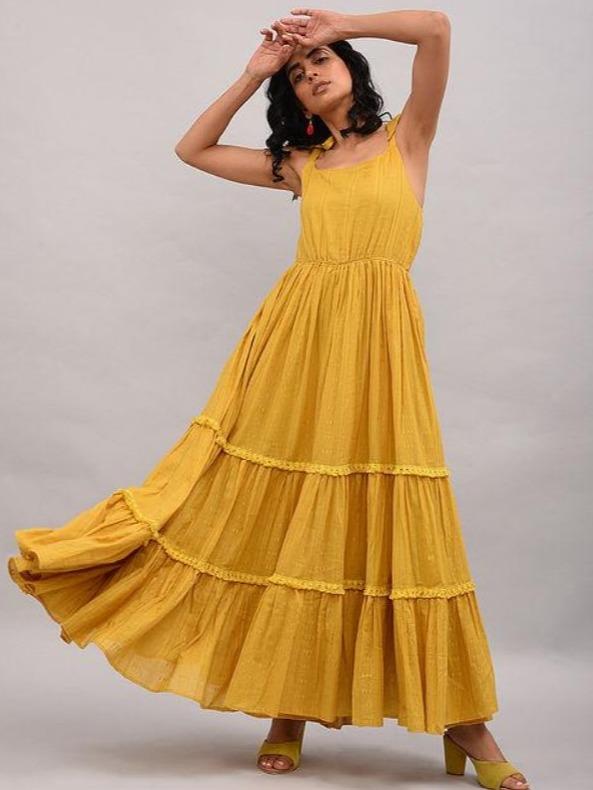 A flared and flounced tiered maxi dress with tie-up belts on the shoulder, elasticated waistline and attached soft cotton lining.